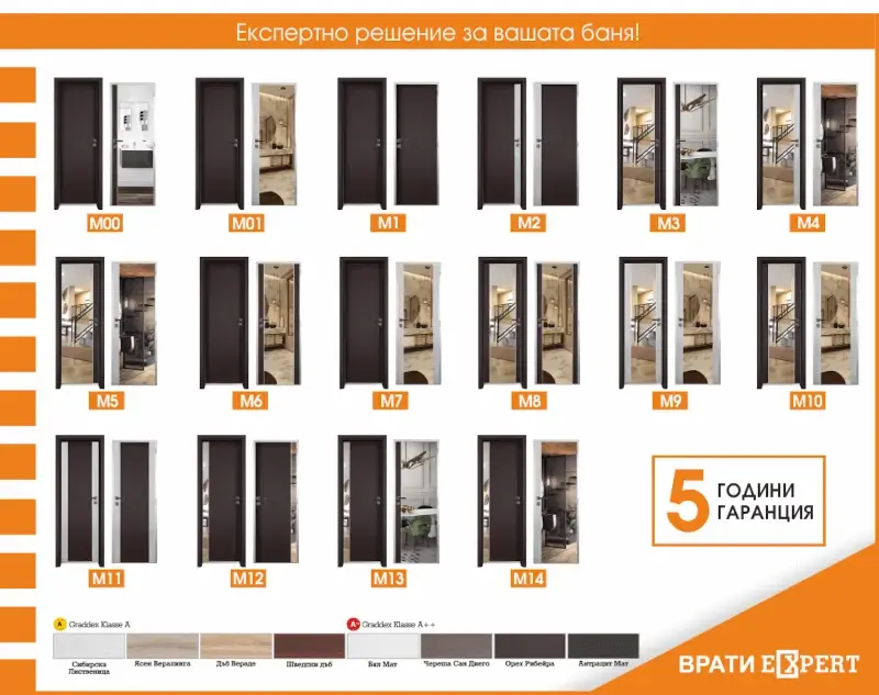 Нова серия алуминиеви врати за баня, чиято външна страна се предлага във всички цветове на Граде. От страната на мокрото помещение имат голямо огледало и малка вертикална част от страната на бравата в цвета на крилото. Има възможност тази част да бъде с алуминиева лайсна – което е препоръчително за помещения, в които вратата ще бъде подложена на обливане с вода.