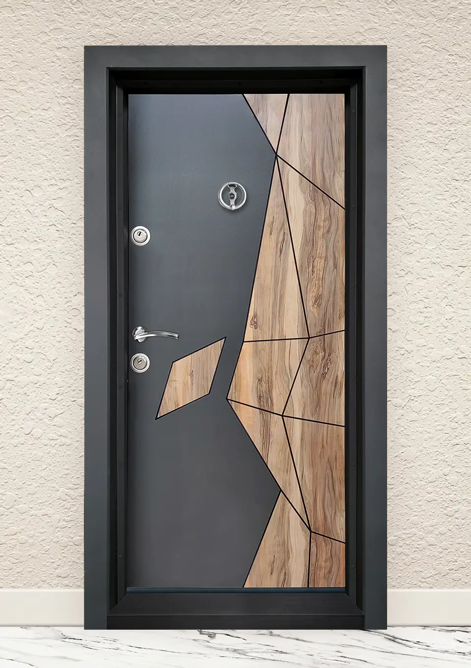 Конструкцията на крилото е съставена от два МДФ панела с дебелина 10 мм, чието покритие е висококачествено PVC фолио с дебелина 200 микрона. Това придава не само стилен и луксозен вид на вратите, но ги прави и устойчиви на надрасквания и наранявания. За шумо и топлоизолация e добавенa минерална вата. Крилото има вграден лист метал с дебелина 1.2 мм. Дебелината на крилото е 70мм. От страната на регулируемите панти, крилото е подсилено с шест пасивни шипа, които при затворено положение влизат в касата. Касата е регулируема, с двустранни первази и е изработена от прахово боядисан метал.