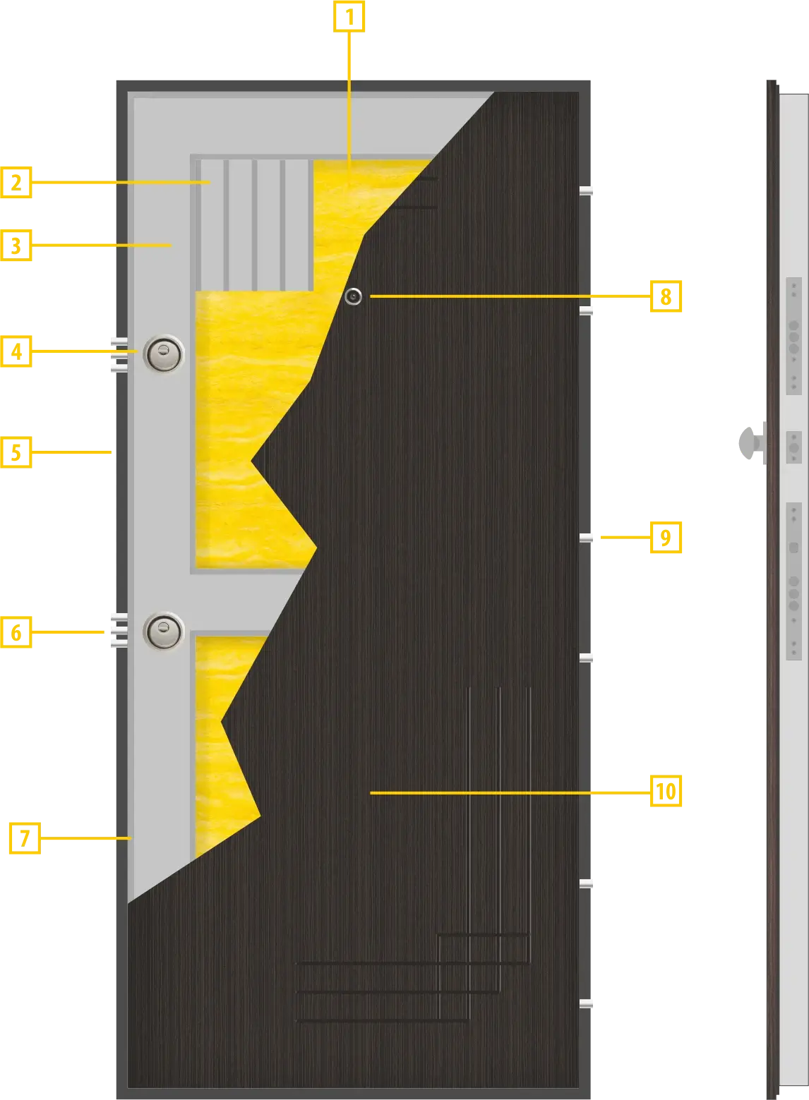Структурата на крилото представлява два 10мм MDF ламинирани панела, между които е поставен метален лист с дебелина 1.2мм. Крилото е с пълнеж за шумо и топло изолация от минерална вата, с допълнително метално оребряване. Дебелината на крилото е 70мм. Лицевият и задният панел са с красива фрезована шарка, която придава стилна завършеност на моделите. От страната на пантите крилото е подсилено с шест пасивни шипа, които при затворено положение на вратата влизат в касата.
