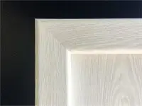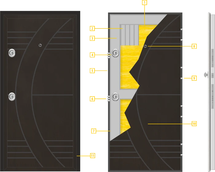 Крилото представлява два MDF панела по 10мм, между които има метален лист с дебелина 1.2мм. Крилото е с пълнеж за шумо и топлоизолация от минерална вата и е с допълнително метално оребряване. Панелът е с ламинатно покритие. Дебелината на крилото е 90мм. Лицевият и вътрешният панел са с красива фрезована шарка, като от вътрешната страна на вратата има допълнителен MDF елемент, който представлява рамка на MDF панела. По този начин се придава стилен и завършен вид на крилото. Има три пасивни шипа, които влизат в касата при затворено положение. За по-добра изолация са поставени и допълнителни гумени уплътнения.